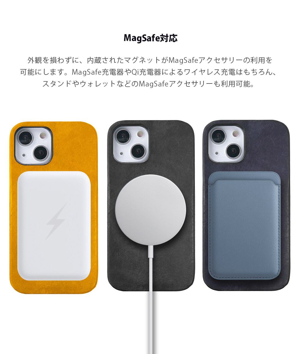 外観を損わずに、内蔵されたマグネットがMagSafeアクセサリーの利用を可能にします。MagSafe充電器やQi充電器によるワイヤレス充電はもちろん、スタンドやウォレットなどのMagSafeアクセサリーも利用可能。