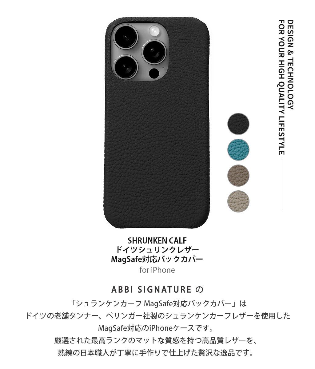 ABBI SIGNATUREの「シュランケンカーフ MagSafe対応バックカバー」はドイツの老舗タンナー、ペリンガー社製のシュランケンカーフレザーを使用したMagSafe対応のiPhoneケースです。厳選された最高ランクのマットな質感を持つ高品質レザーを、熟練の日本職人が丁寧に手作りで仕上げた贅沢な逸品です。
