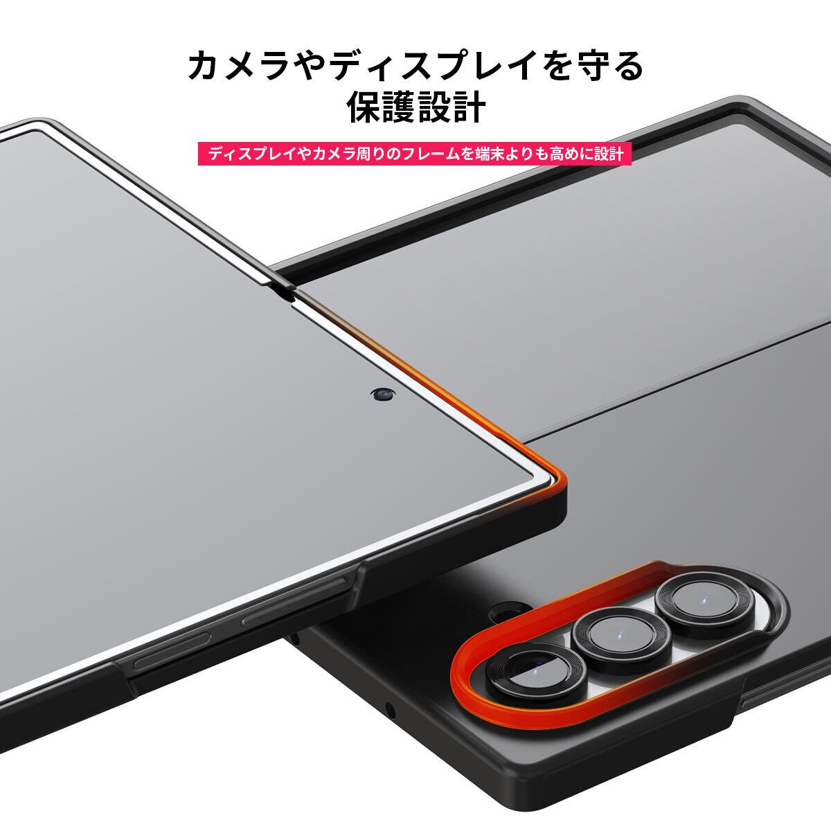 カメラホール部やディスプレイの周囲は端末本体よりわずかに高く設計されています。床やテーブルに直接置いた場合でもレンズやディスプレイが接地面に触れにくく、傷からしっかり守ります。