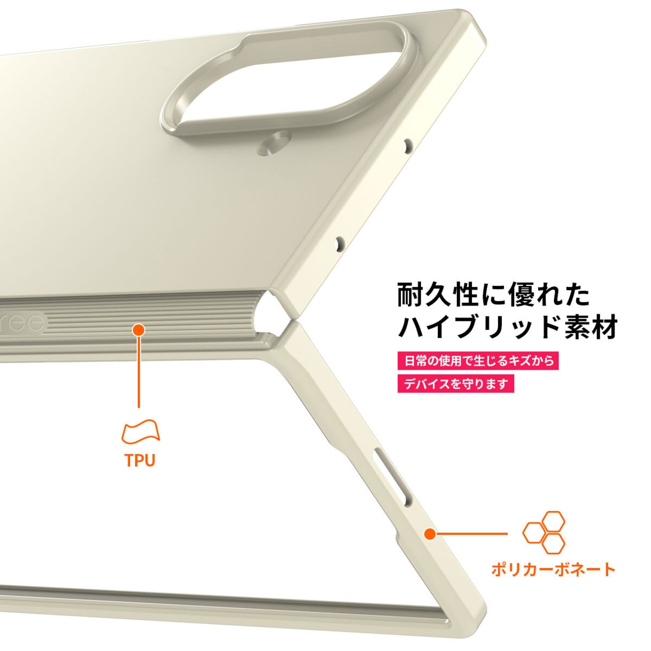 ケースの本体には外部衝撃に強いポリカーボネート、ヒンジ部には柔軟なTPU素材を使用し、部位に応じた最適な素材で構成されています。日常の使用で生じるキズからデバイスを守ります。