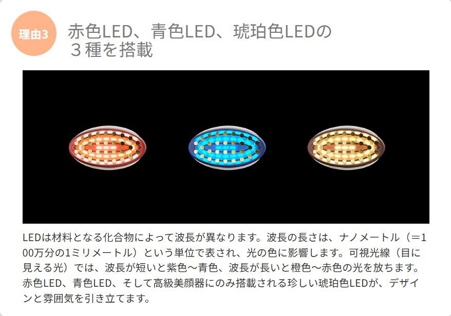 ●LEDには、さまざまな色の種類がありますが、光の色によって波長が異なるため美肌効果にも違いがあります。一般的に、美顔器で搭載されるLEDには赤色と青色の2色がほとんどですが、スタンプリフトフェザーは、琥珀色LEDの搭載にこだわりました。