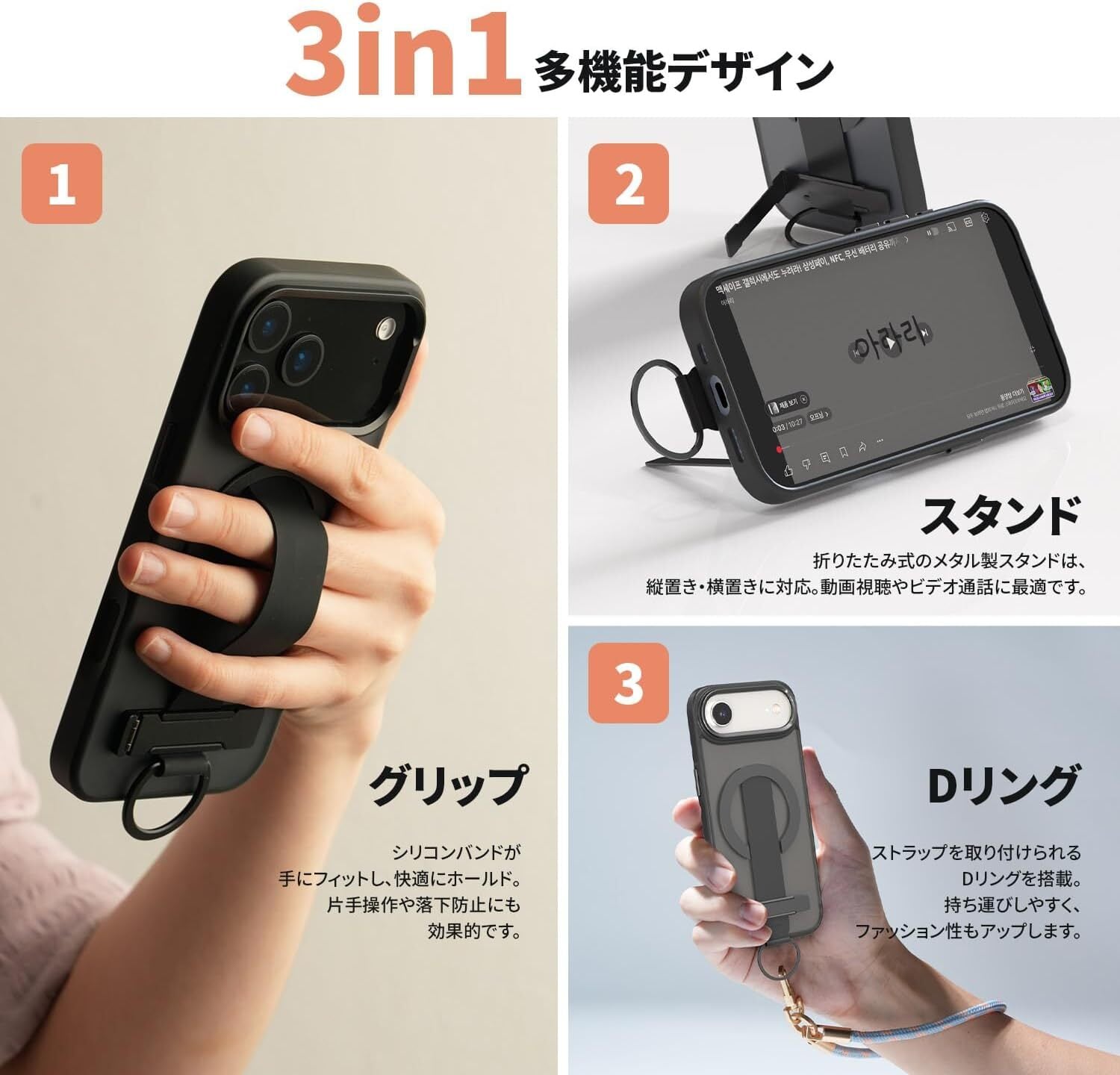 araree の「DUPLE M GRIP」は、耐衝撃性能に優れたミルスペック準拠の MagSafe対応iPhoneケースです。折りたたみ式のメタルスタンド、シリコン製グリップ、Dリングを搭載し、使いやすさと安心感を同時に提供します。