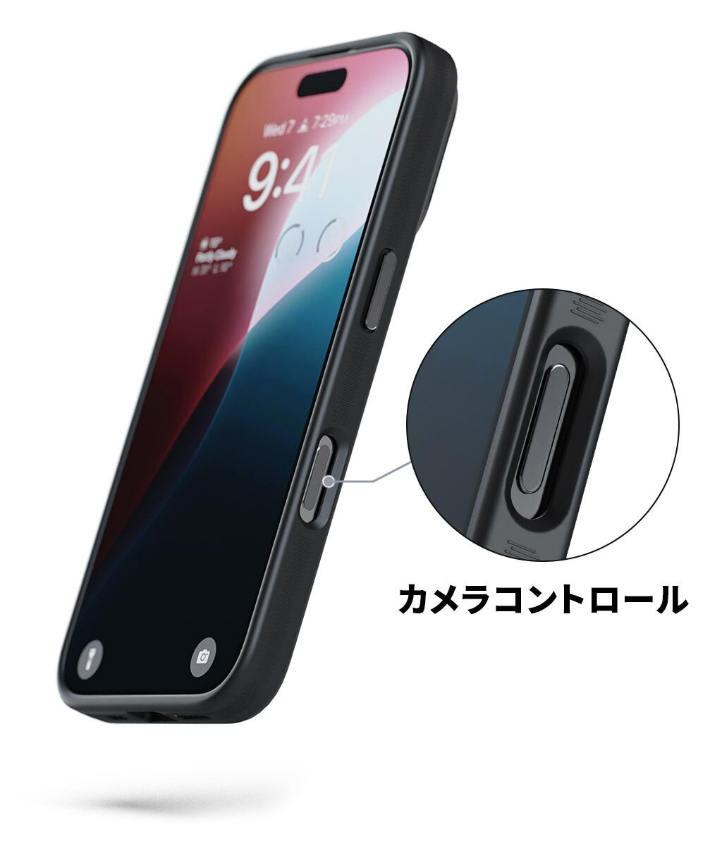 背面は耐久性に優れたポリカーボネート、バンパー部分は衝撃吸収に優れたTPUを使用したハイブリッドケースです。