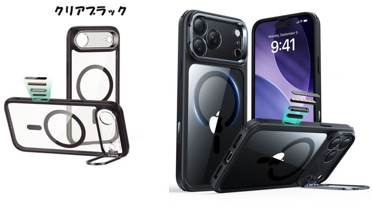 ESR「Classic スタンド付きハイブリッドケース 」は、カメラフレームが隠しスタンドとして展開するハイブリッドクリアケースです。MagSafe対応アクセサリがスムーズに吸着する、強力なマグネットを搭載しています。