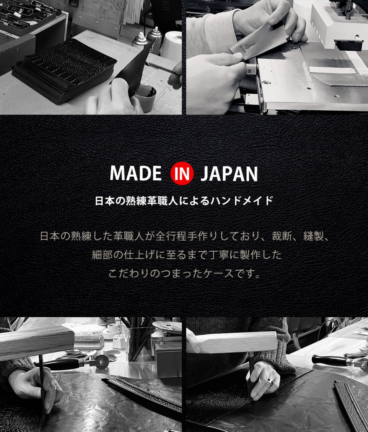 日本の熟練した革職人が全工程手作りしており、裁断、縫製、細部の仕上げに至るまで丁寧に製作したこだわりのつまったケースです。