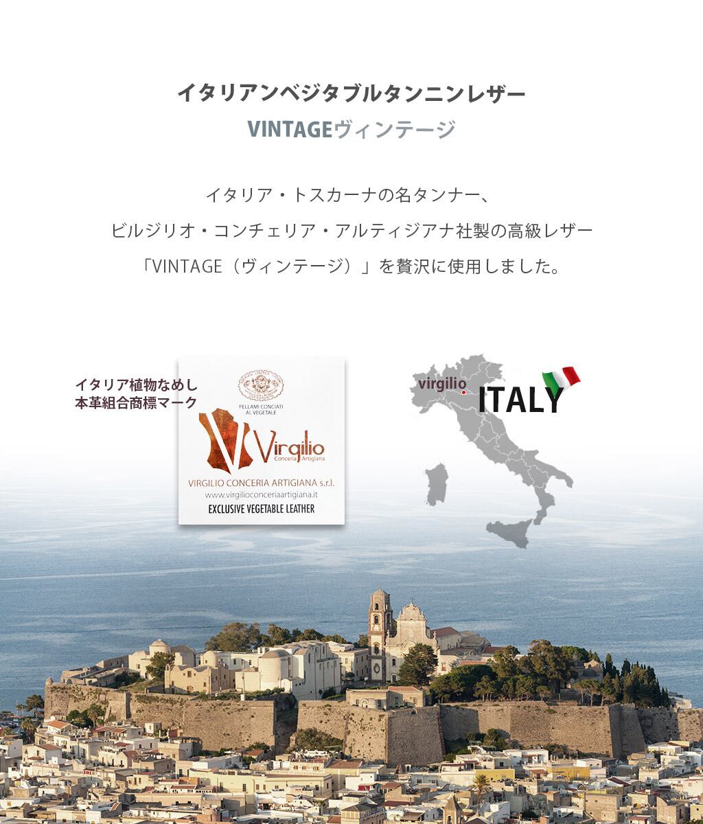 イタリア・トスカーナの名タンナー、Virgilio Conceria Artigiana ( ヴィルジリオ・コンチェリア・アルティジャーナ)社製の高級レザー「VINTAGE(ヴィンテージ)」を贅沢に使用しました。