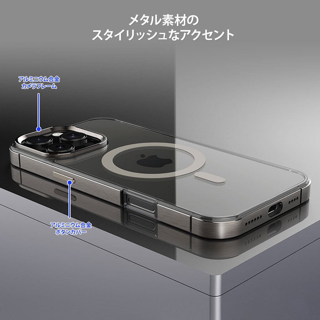motomo(モトモ)の「MagSafe対応 METAL CASE」は、ポリカーボネート背面とTPU+アルミニウム合金のバンパーがデバイスを強力に守る、スタイリッシュなMagSafe対応クリアケースです。アルミ製のカメラホールとボタンカバーが高級感を際立たせ、デザインと機能性を両立した一品です。