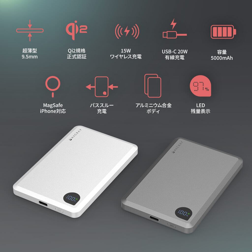 国内正規品 HACRAY AirSlim Qi2対応 モバイルバッテリー マグネットワイヤレスバッテリー MagSafe対応 モバイルバッテリー ハクライ HR-Q112L-SG HR-Q112L-SW