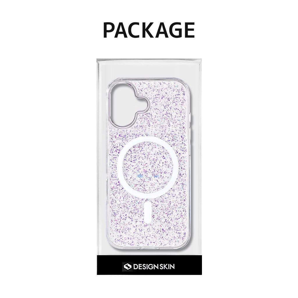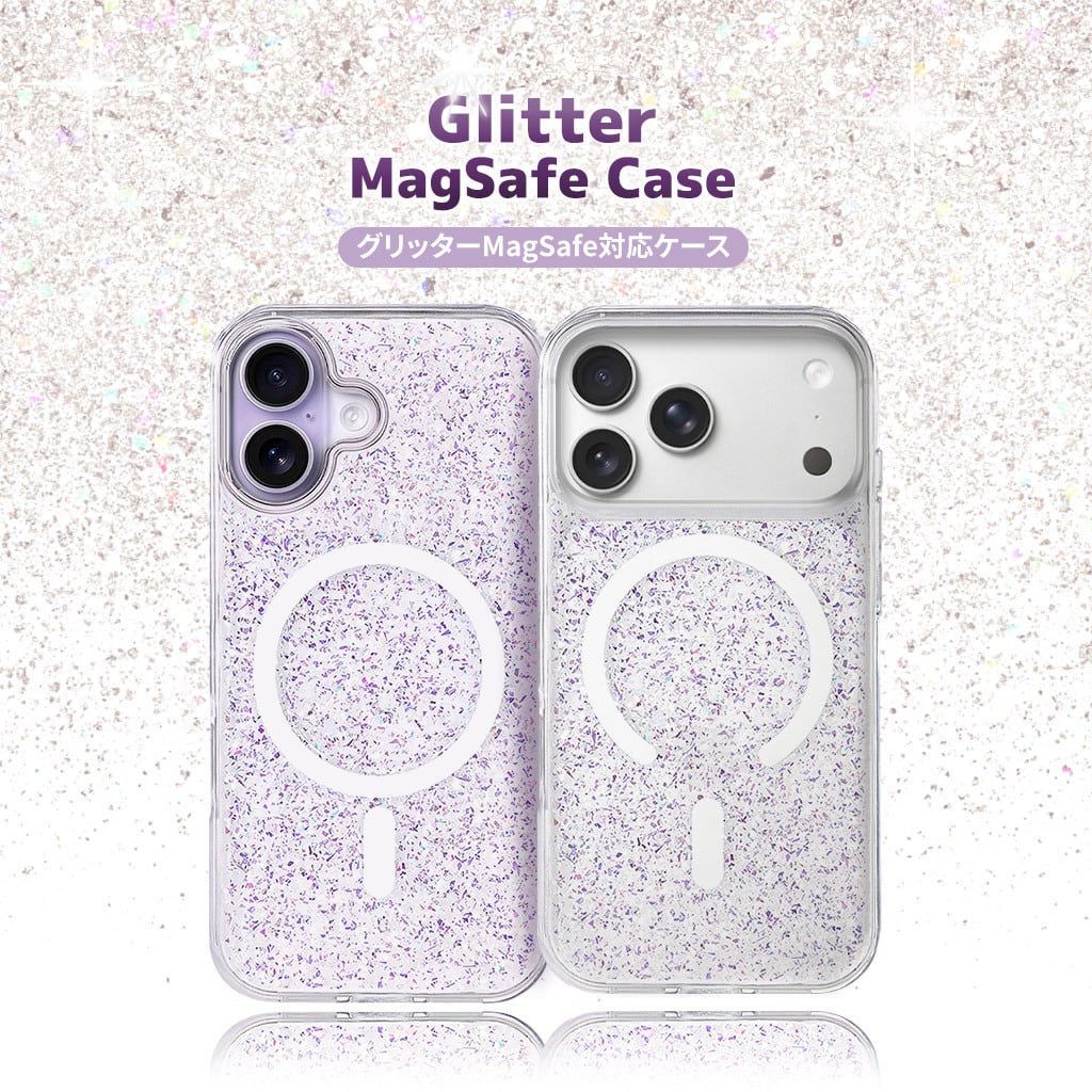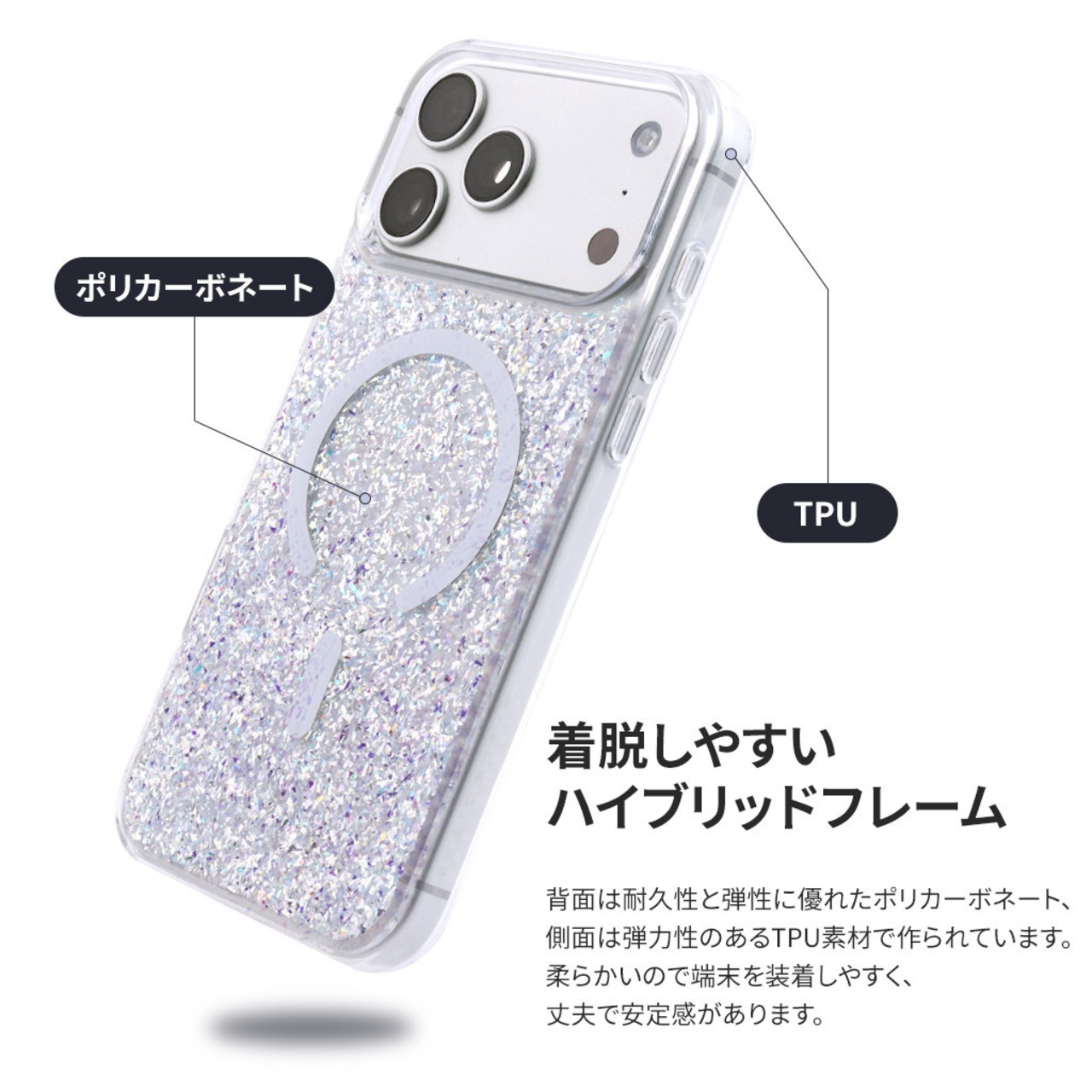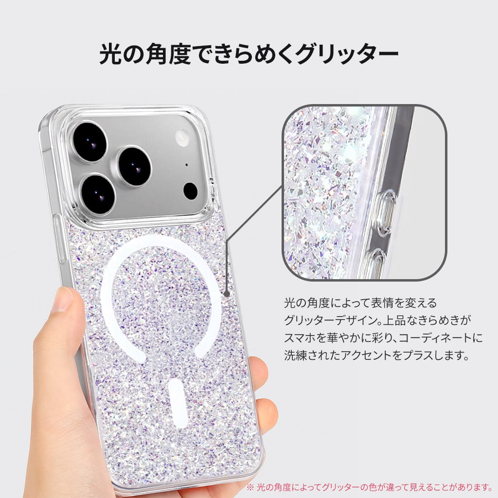 DESIGN SKIN 「グリッターMagSafe対応ケース」は、光の角度できらめくグリッターデザインが、スマホを華やかに演出。