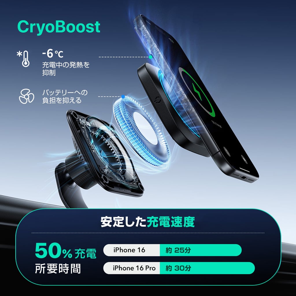 内蔵ファンCryoBoost (クライオブースト)が、充電中の発熱を効果的に抑制。一般的な充電器に比べ、デバイス温度を約6℃低下させます。スマートフォンのバッテリーへの負担を抑えつつ、安定した充電速度を維持します。