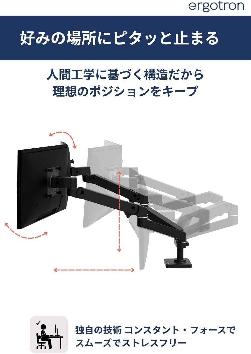 【エルゴトロン独自のコンスタント・フォース技術】モニターの位置、角度、高さの調整が軽い力で自由自在。好きなところでピタッと止まり、ぶれることがありません。