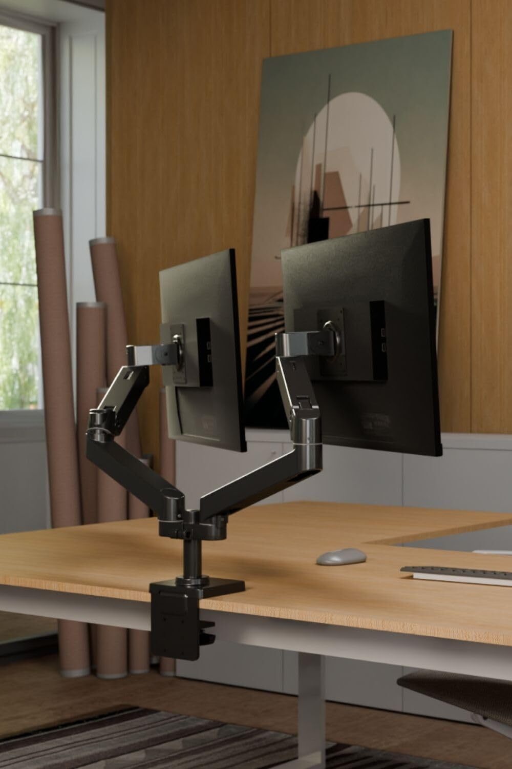 ●【多くのモニターをサポート】従来のLXデュアル横型より軽いモニターを設置できます。27インチまで、1モニター1.8kgから9kgまで/総重量3.6kgから18.1kgまでのモニターに対応、VESA 100x100mm、75x75mm。