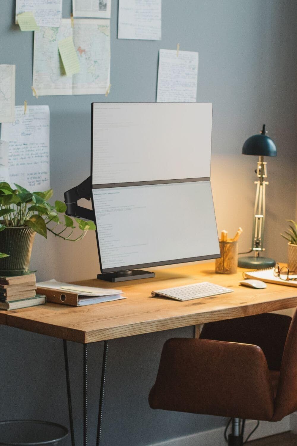 ●【2画面を横並びに】横並び配列のデュアルモニター環境にぴったりなモニターアームです。モニターはそれぞれ動かせます。