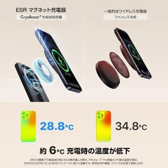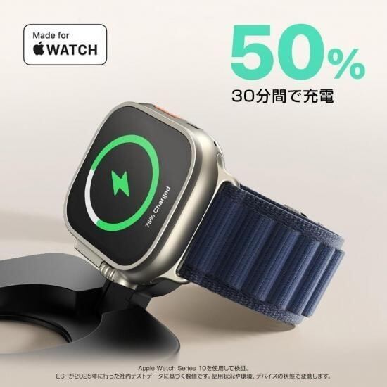 ESR「Qi2 25W認証 3in1 マグネット式折りたたみ充電ステーション」は、iPhone・Apple Watch・AirPodsを1台でまとめて充電できるオールインワン充電スタンドです。Qi2 25Wの急速ワイヤレス充電に加え、ESR独自の「CryoBoost」冷却技術が発熱を抑えて安定した充電スピードを維持します。マグネット充電部は、iPhoneのほかQi2機能を搭載したスマートフォンの充電にも対応しています