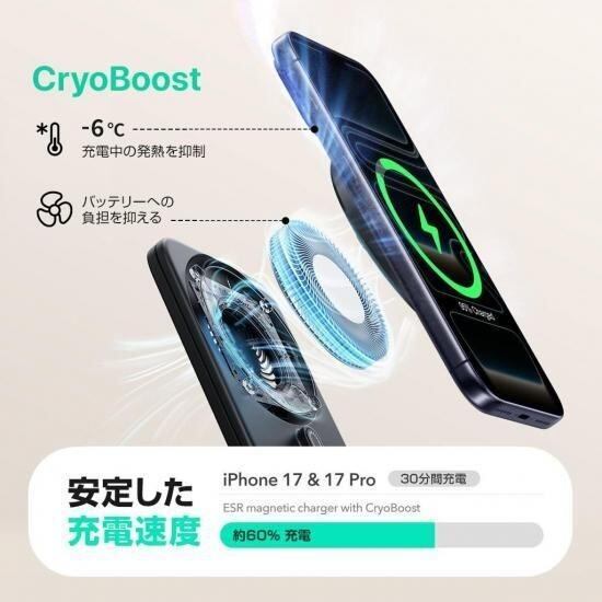 最新Qi2.2公式認証チップを搭載し、対応するスマートフォンを最大25Wでワイヤレス急速充電。iPhone17 Proなら30分で約60%まで充電可能です