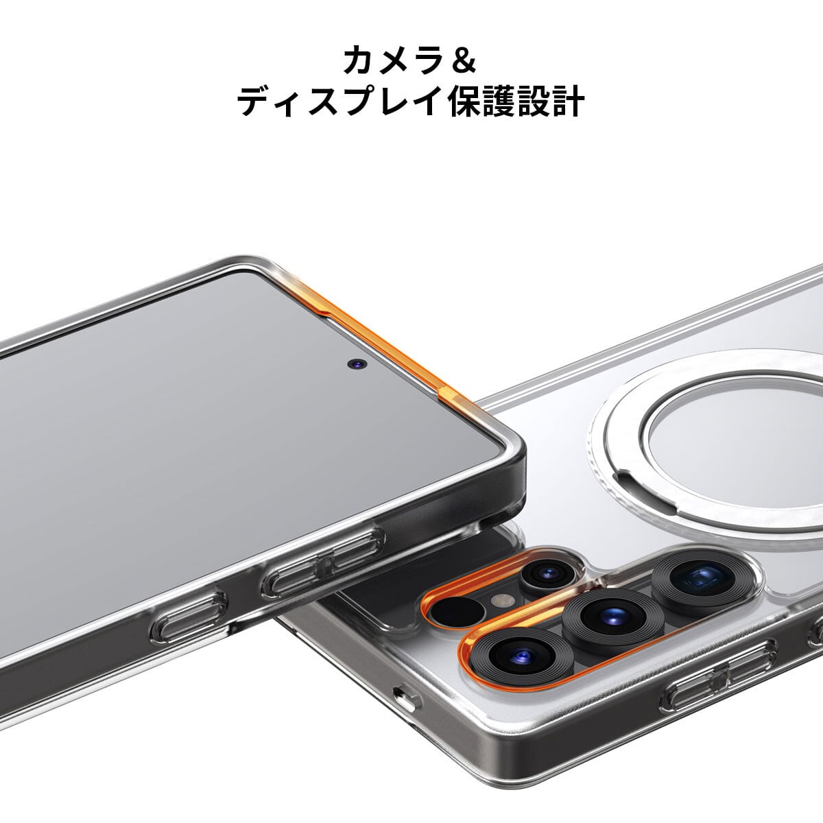 カメラホールやディスプレイ周囲を端末本体よりわずかに高く設計。置いた際にレンズやディスプレイが接地面に触れず、傷つきにくくなっています。