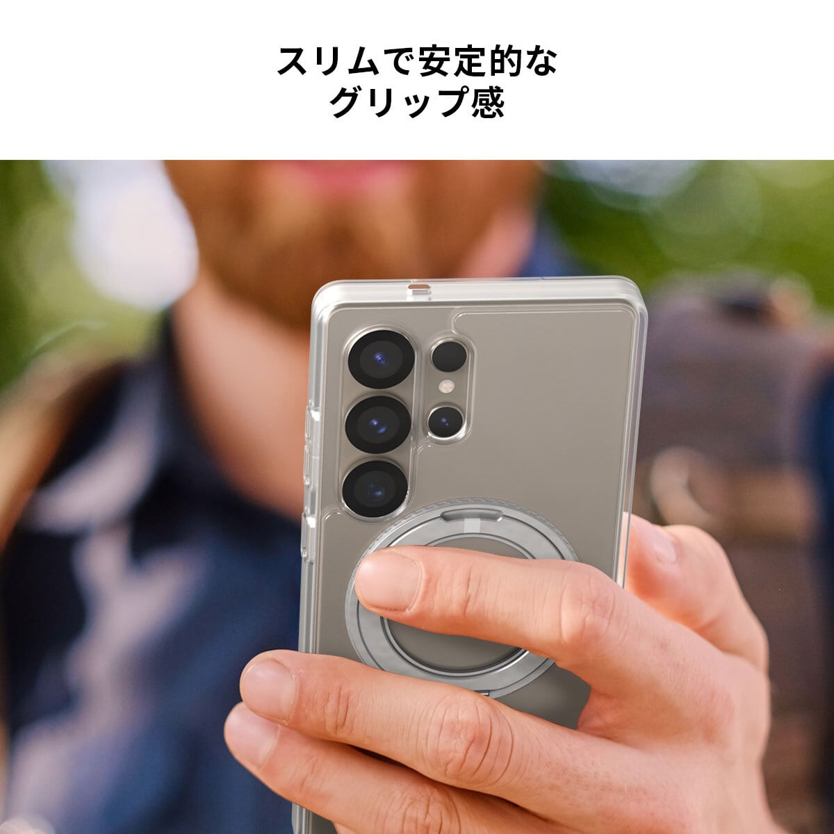 フリーストップヒンジを採用し、25°~105°の角度を調整可能。リングが360度回転することで、縦置き・横置きのどちらにも対応し、安定した使用が可能です。リングスタンド中央の溝により、スムーズにスタンドを引き出せる使いやすい設計です。