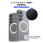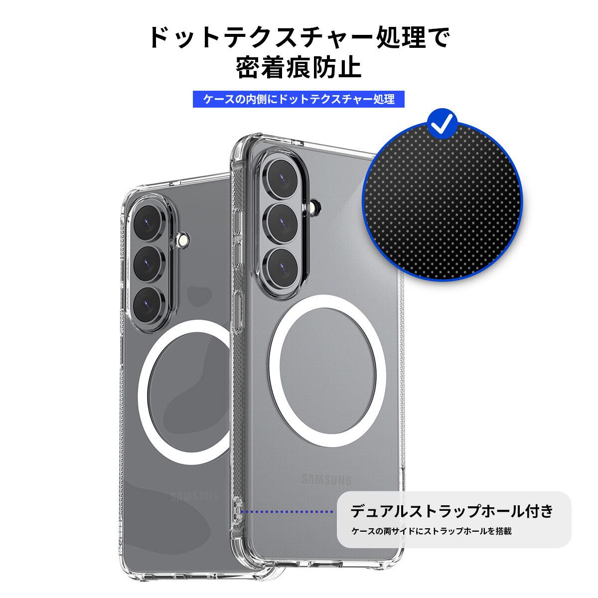 ケースの内側にドットテクスチャー処理を施し、端末への貼りつきが原因で起こる密着痕を防止します。