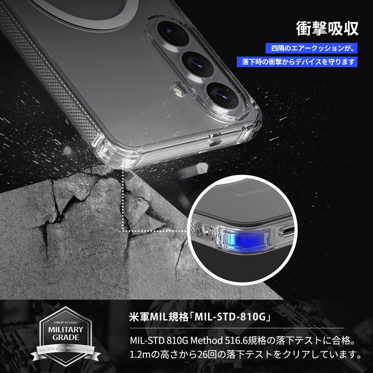 四隅のエアークッションが、落下時の衝撃からデバイスを守ります。
