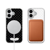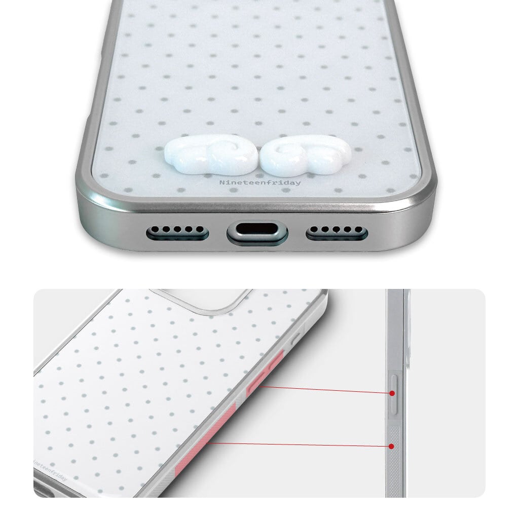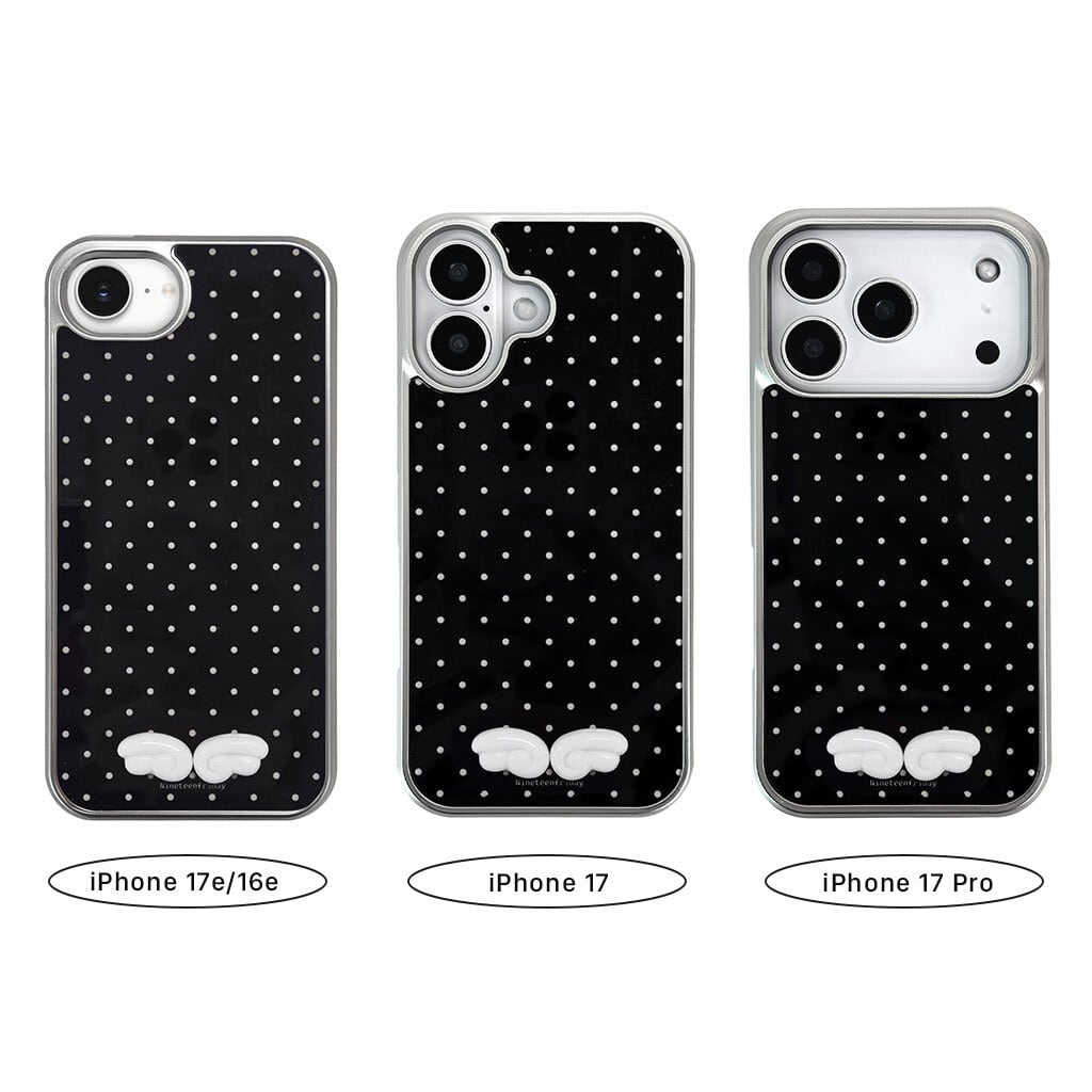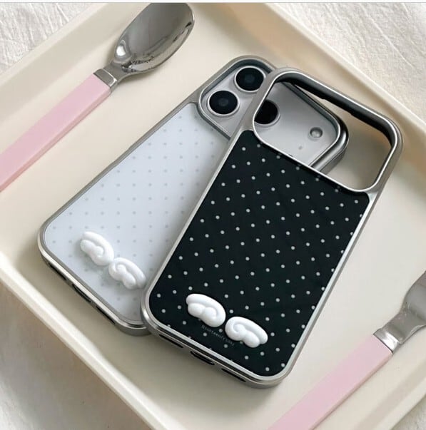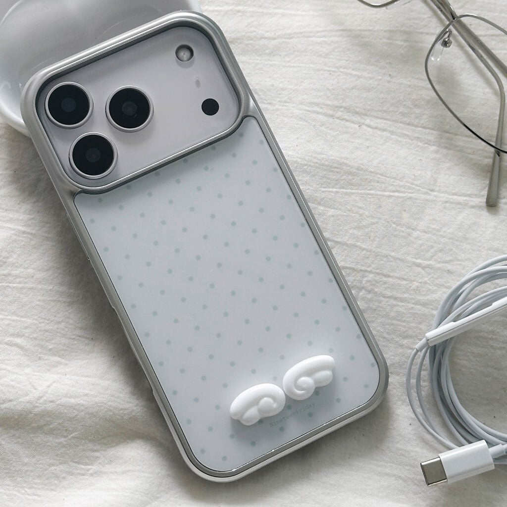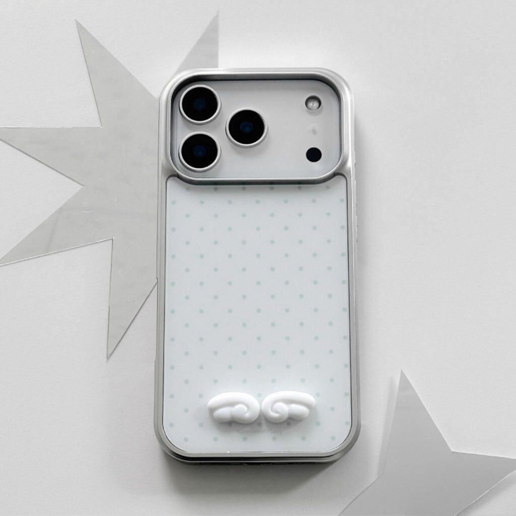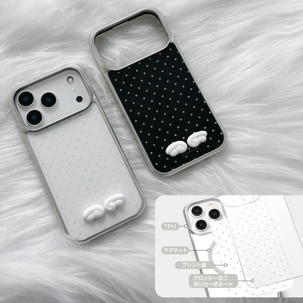 「3Dエンジェルウィング MagSafe対応グロッシーケース」は、ドット柄ベースに映える立体エンジェルウィングデザインと、ガラスのような艶感が美しいグロッシー仕上げを組み合わせたiPhoneケース。MagSafe対応の実用性も兼ね備えた、大人かわいい一品です。