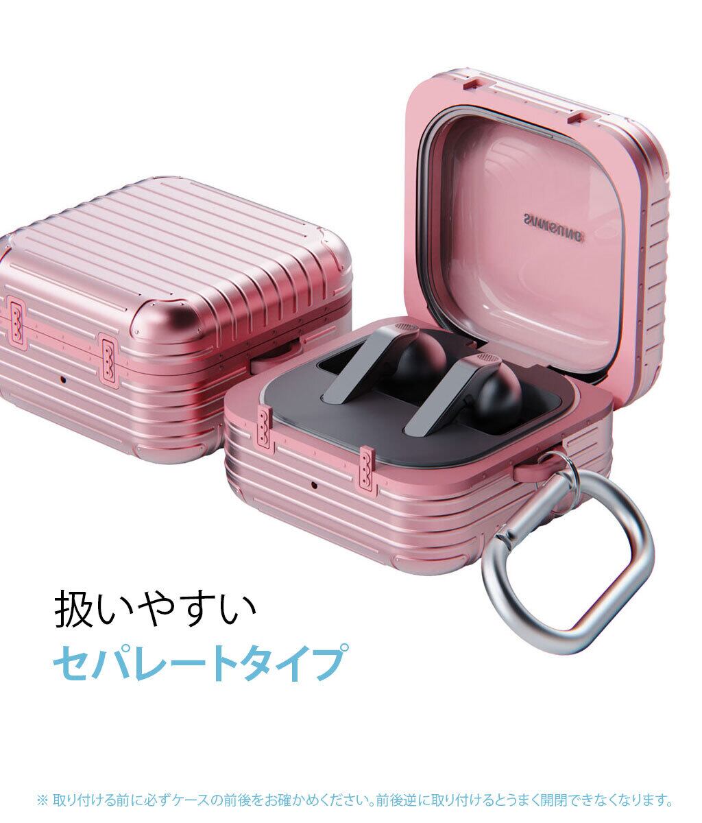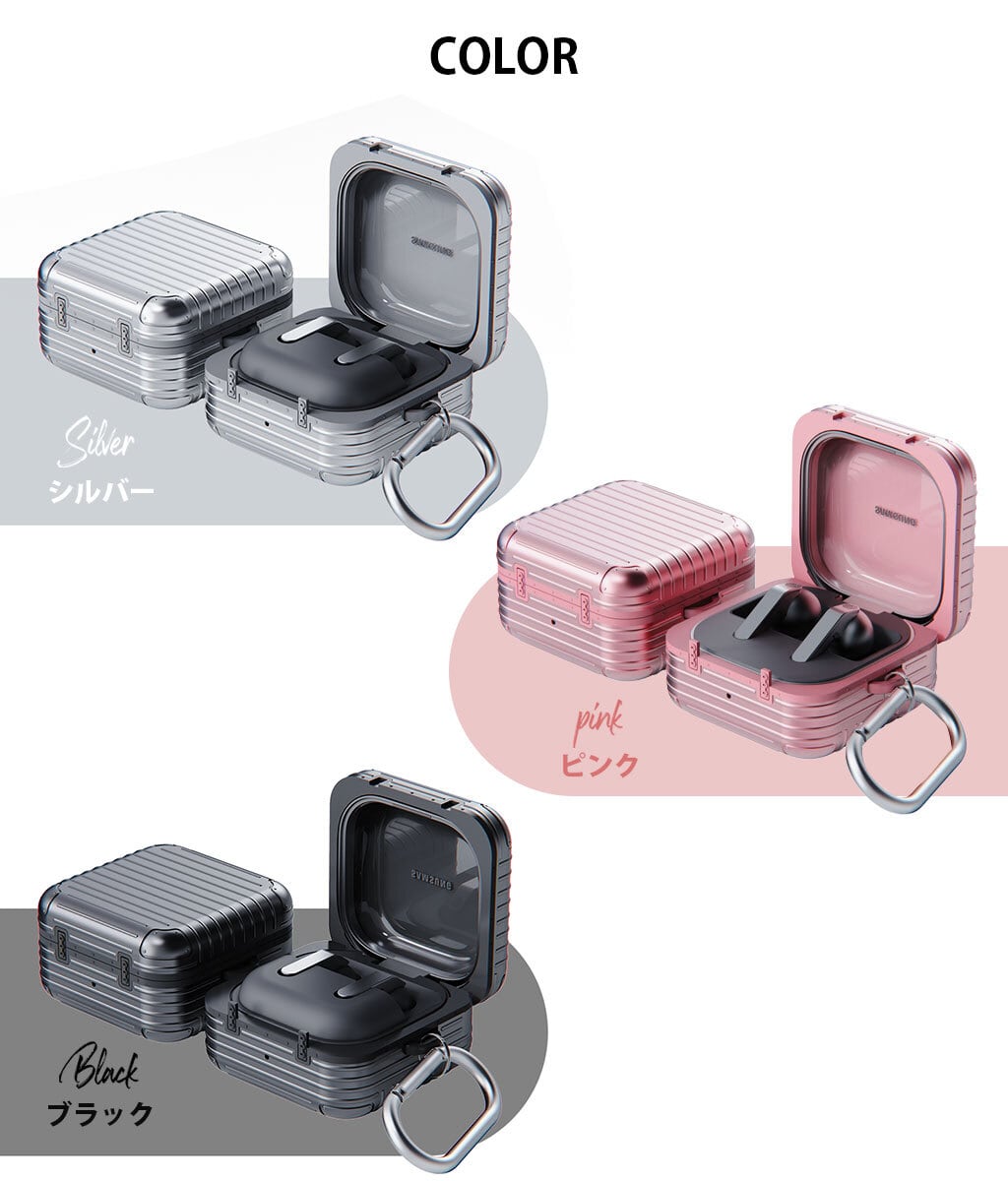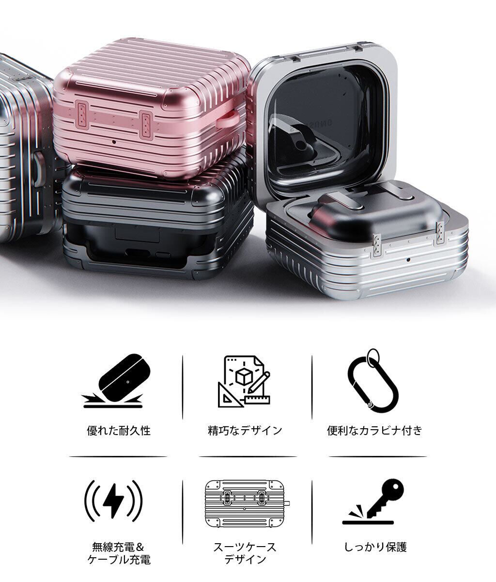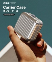 miak 「キャリーケース」は細部にまでこだわったスーツケースデザインがユニークなGalaxy Budsケースです。軟質のTPUと硬質なポリカーボネートの二重構造でしっかり保護、持ち運びに便利なカラビナも付属します。
