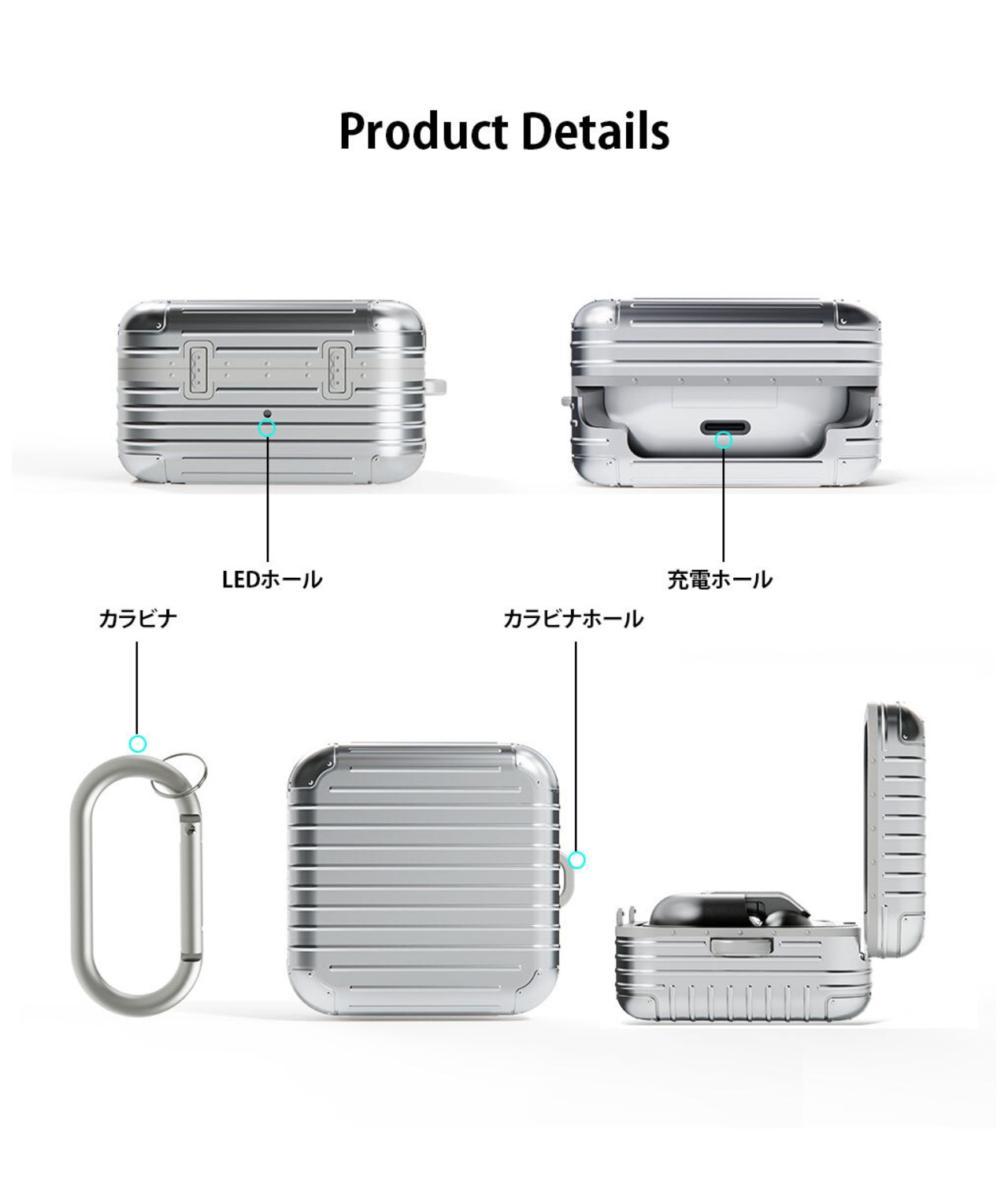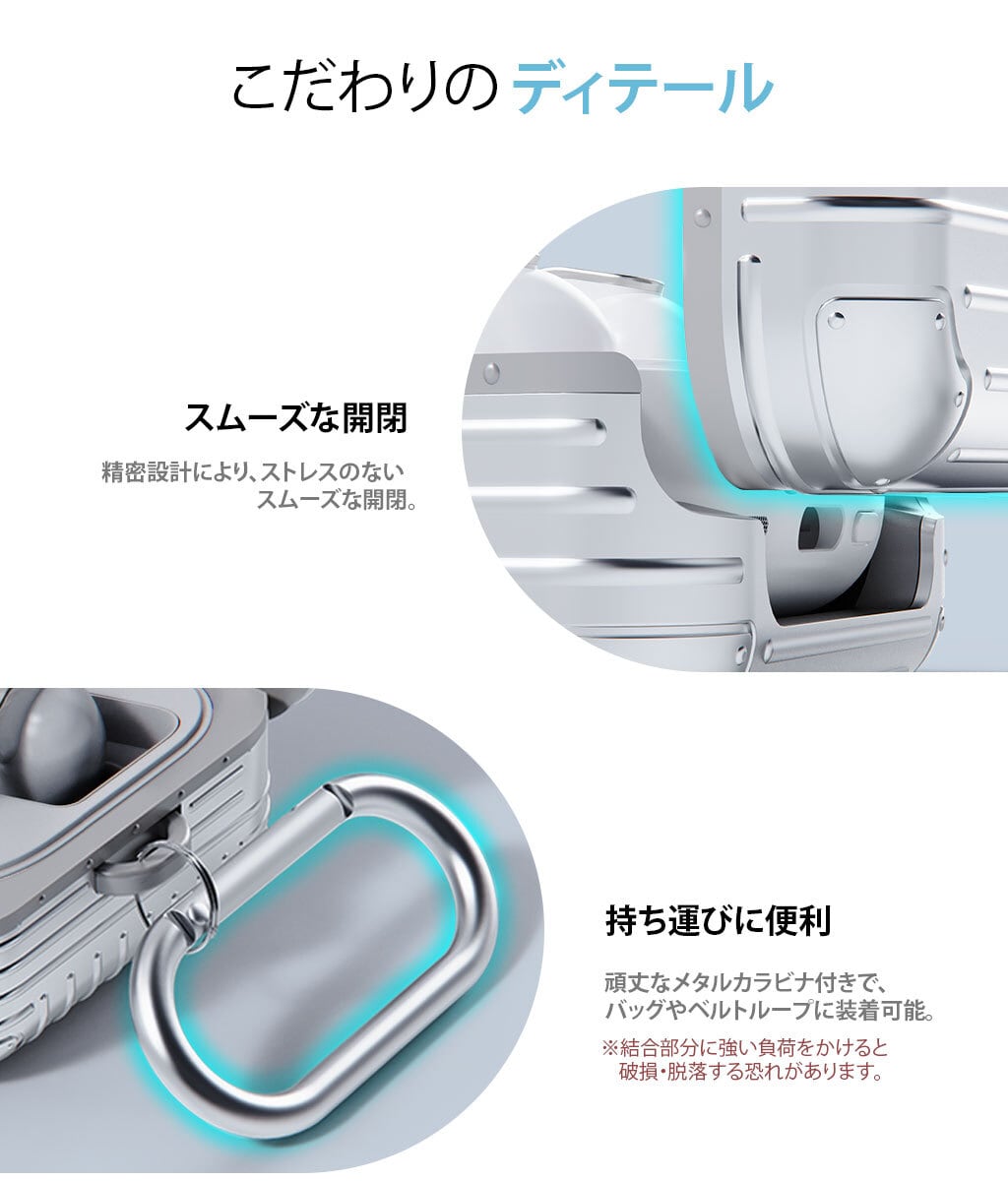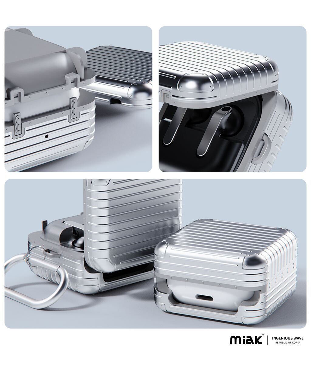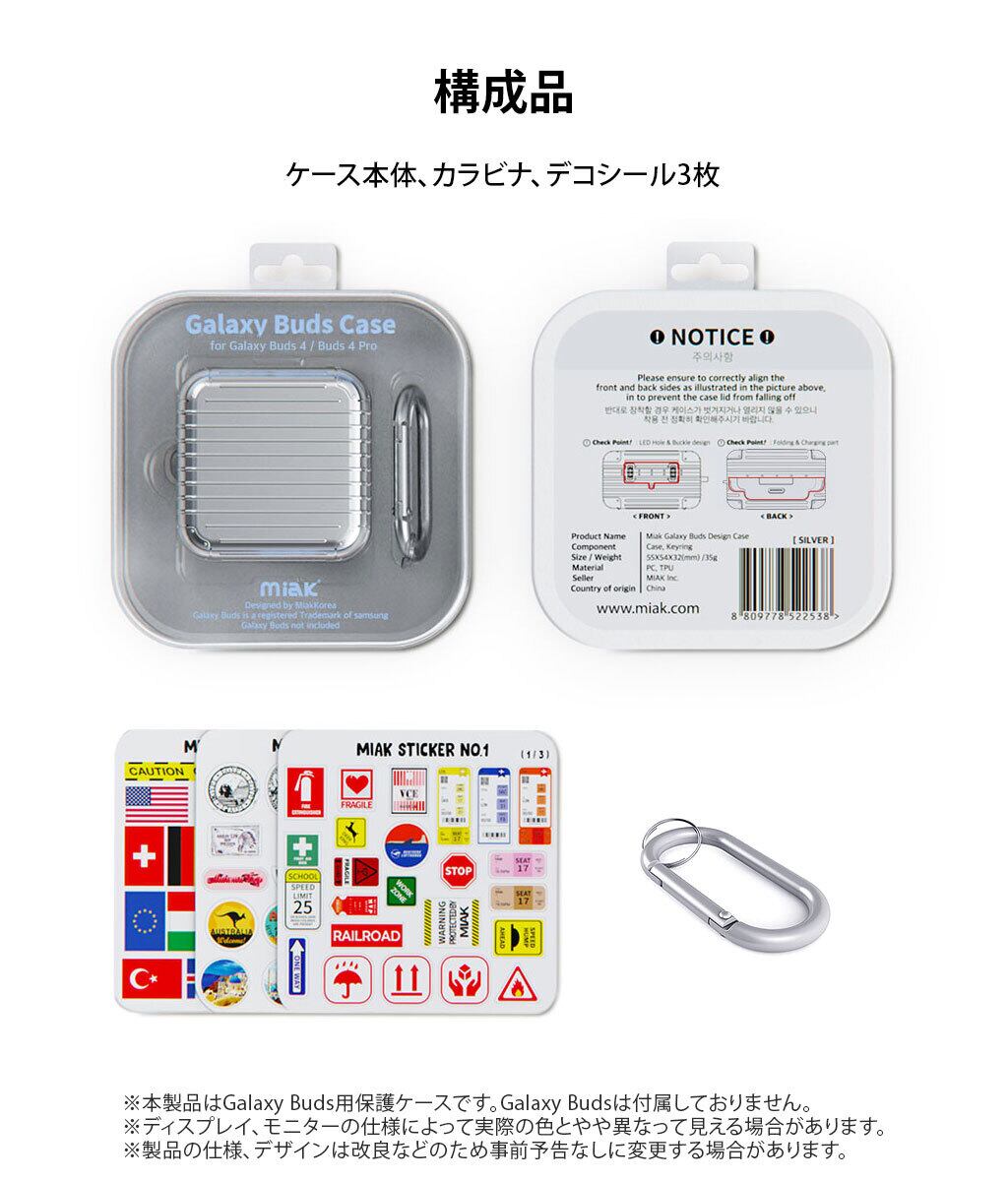 miak 「キャリーケース」は細部にまでこだわったスーツケースデザインがユニークなGalaxy Budsケースです。軟質のTPUと硬質なポリカーボネートの二重構造でしっかり保護、持ち運びに便利なカラビナも付属します。