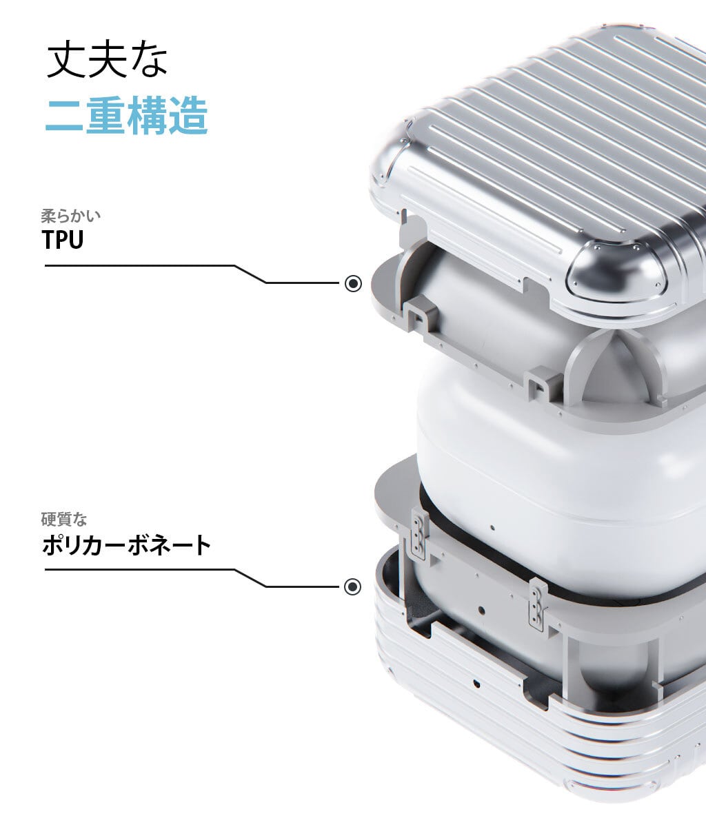 内側は柔らかいTPU素材、外側は硬質なポリカーボネート素材の二重構造でしっかり保護します。