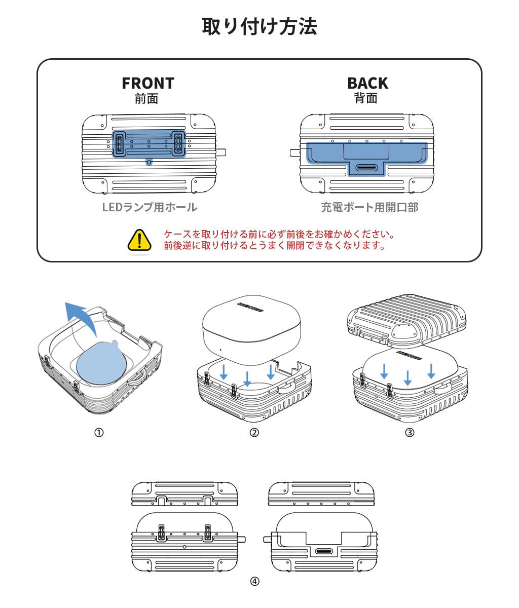 ※取り付ける前に必ずケースの前後をお確かめください。前後逆に取り付けるとうまく開閉できなくなります。