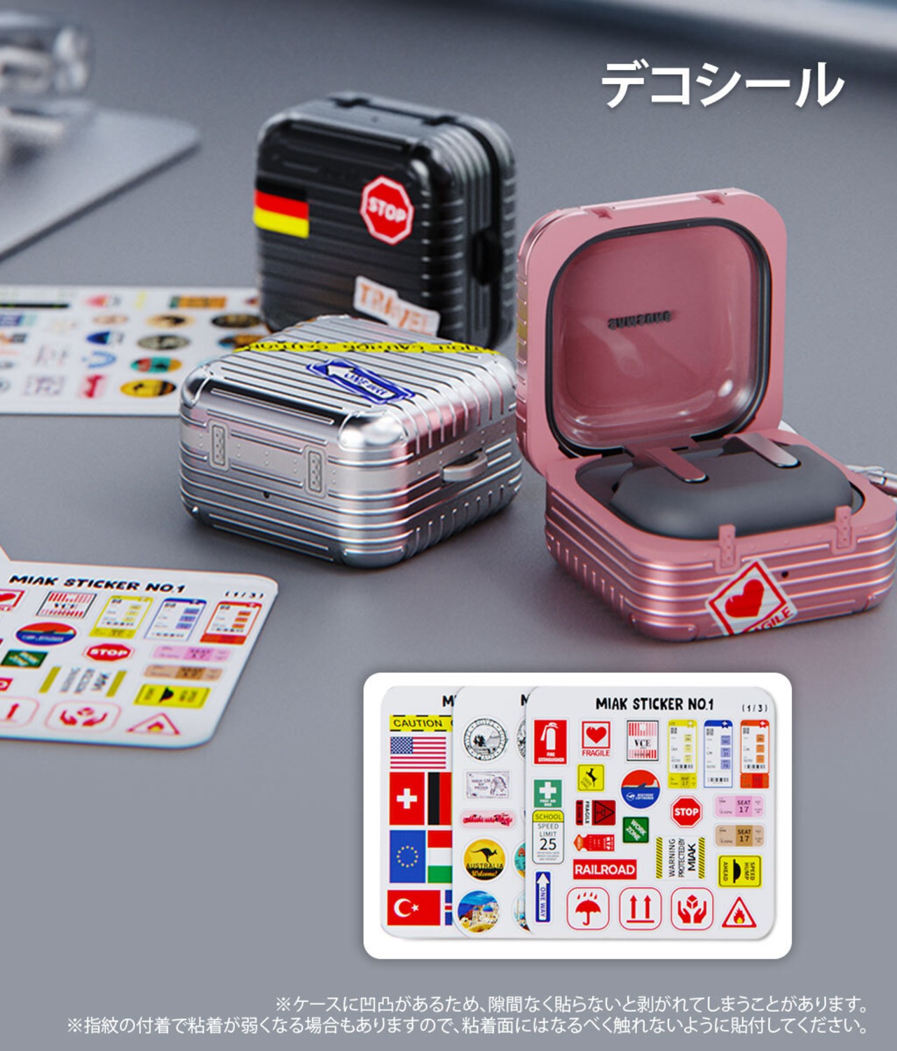 Galaxy Budsキャリーケースにピッタリな、国旗やエンブレムのデコシールが同梱されています。自分好みにカスタマイズしたデザインを楽しめます。