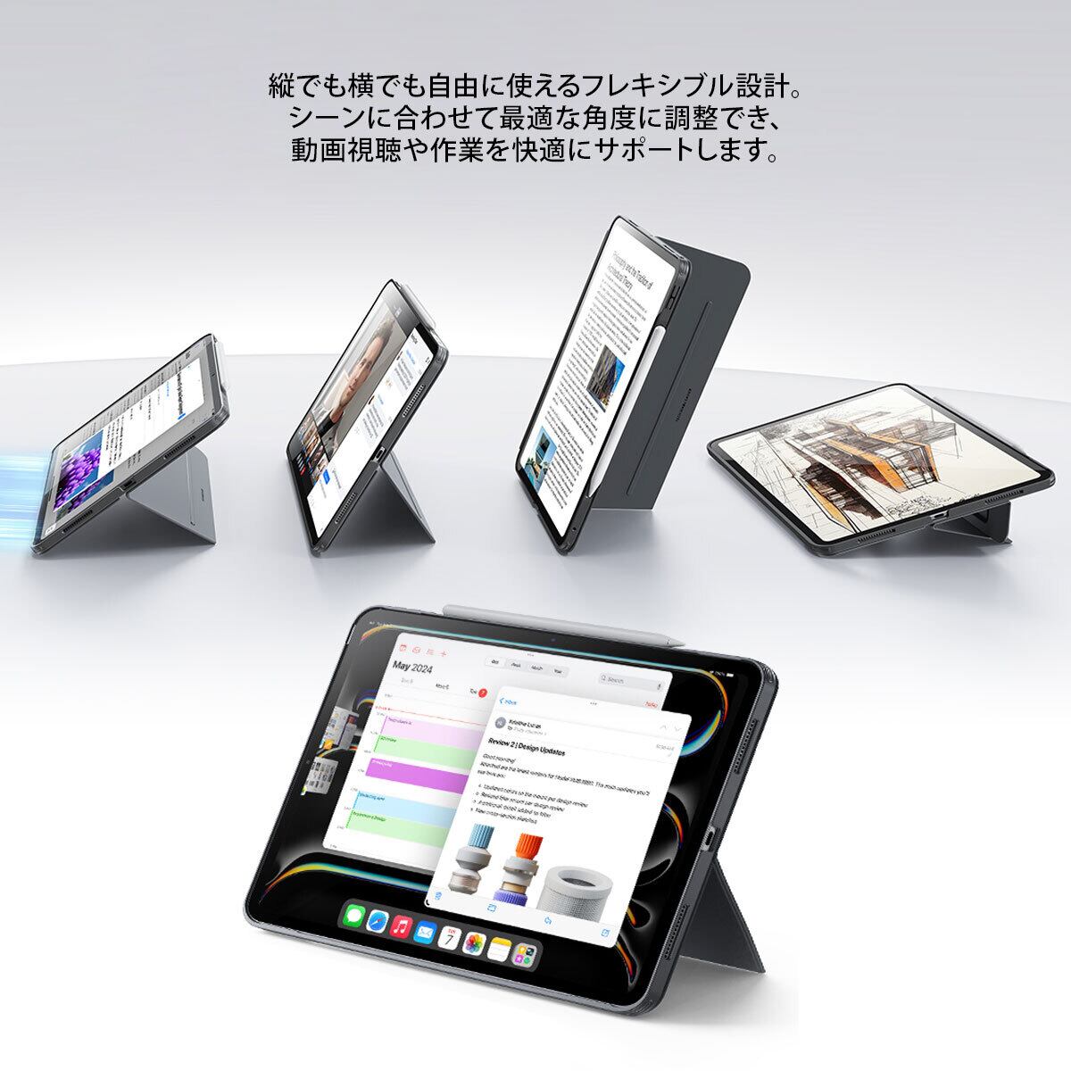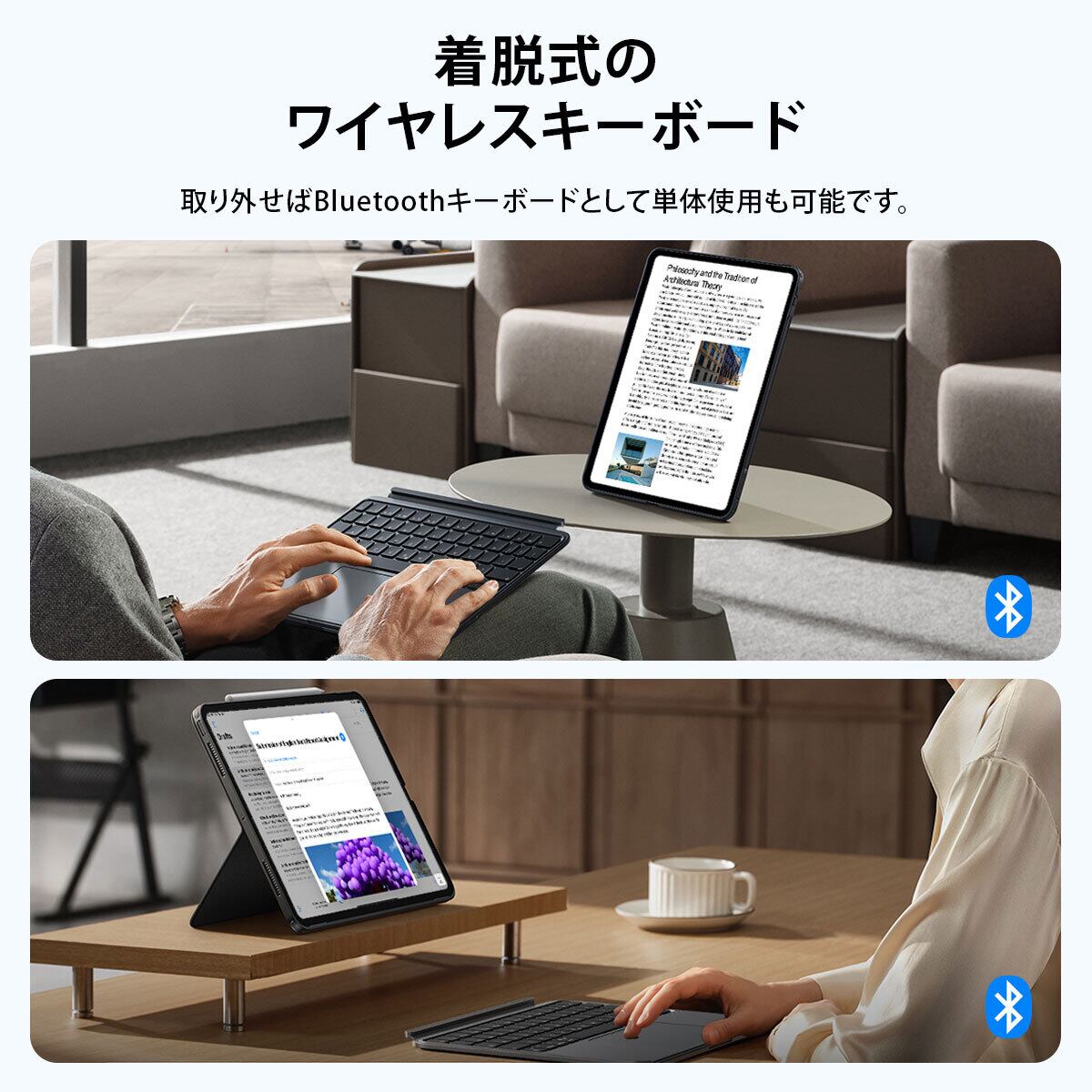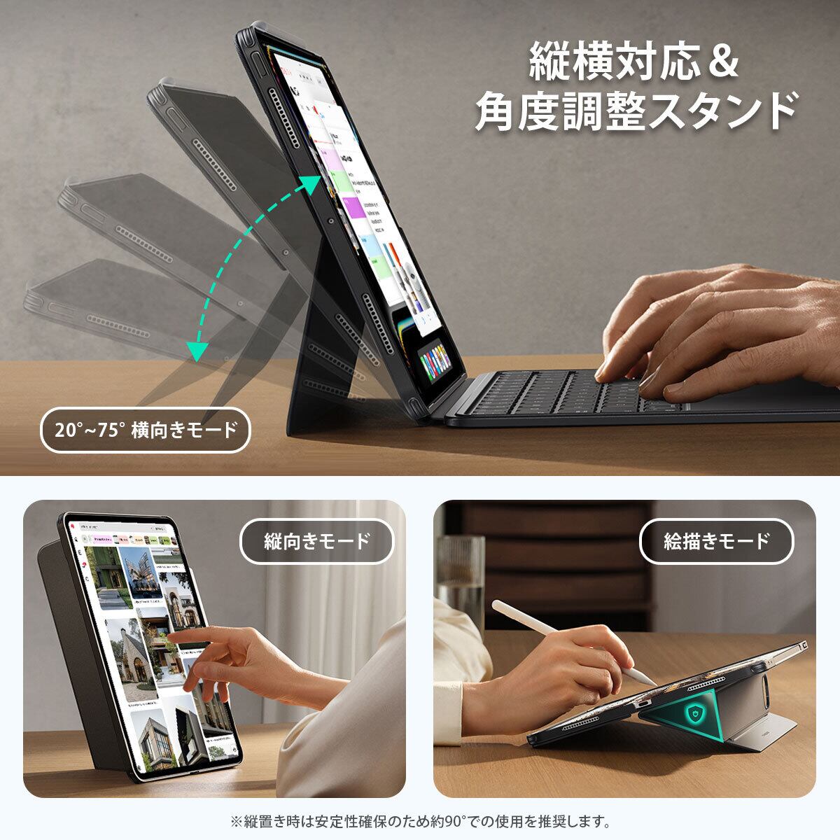 ESR「SHIFT 着脱式キーボードケース」は、キーボードとトラックパッドを一体化した、iPadをノートPC化するBluetoothケースです。 マグネットで簡単に着脱でき、キーボードを取り外せば離れた場所でもワイヤレスでタイピングが可能。縦横両対応のスタンド機能やApple Pencil収納など、使い勝手にも優れています。