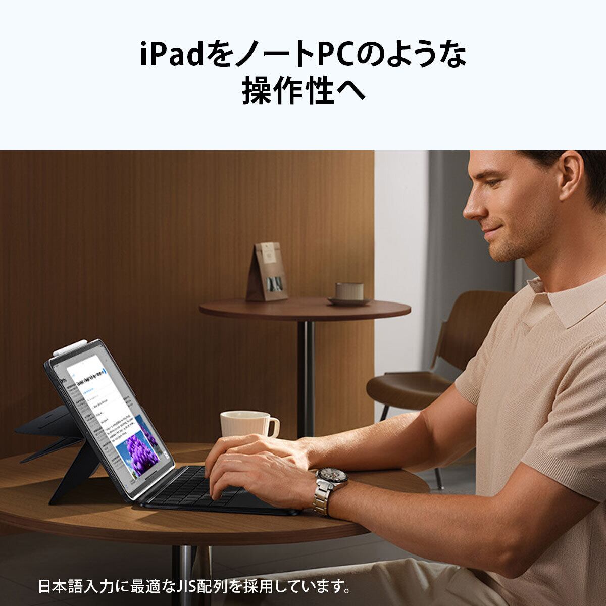 キーボードとトラックパッドで、iPadを本格的な作業デバイスに。各種ショートカット操作にも対応し、文章作成や作業効率が大幅に向上します。日本語入力に最適なJIS配列を採用しています。