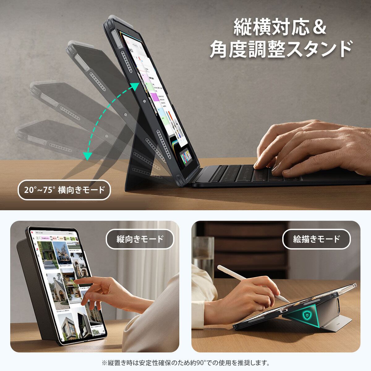 ESR「SHIFT 着脱式キーボードケース」は、キーボードとトラックパッドを一体化した、iPadをノートPC化するBluetoothケースです。 マグネットで簡単に着脱でき、キーボードを取り外せば離れた場所でもワイヤレスでタイピングが可能。縦横両対応のスタンド機能やApple Pencil収納など、使い勝手にも優れています。