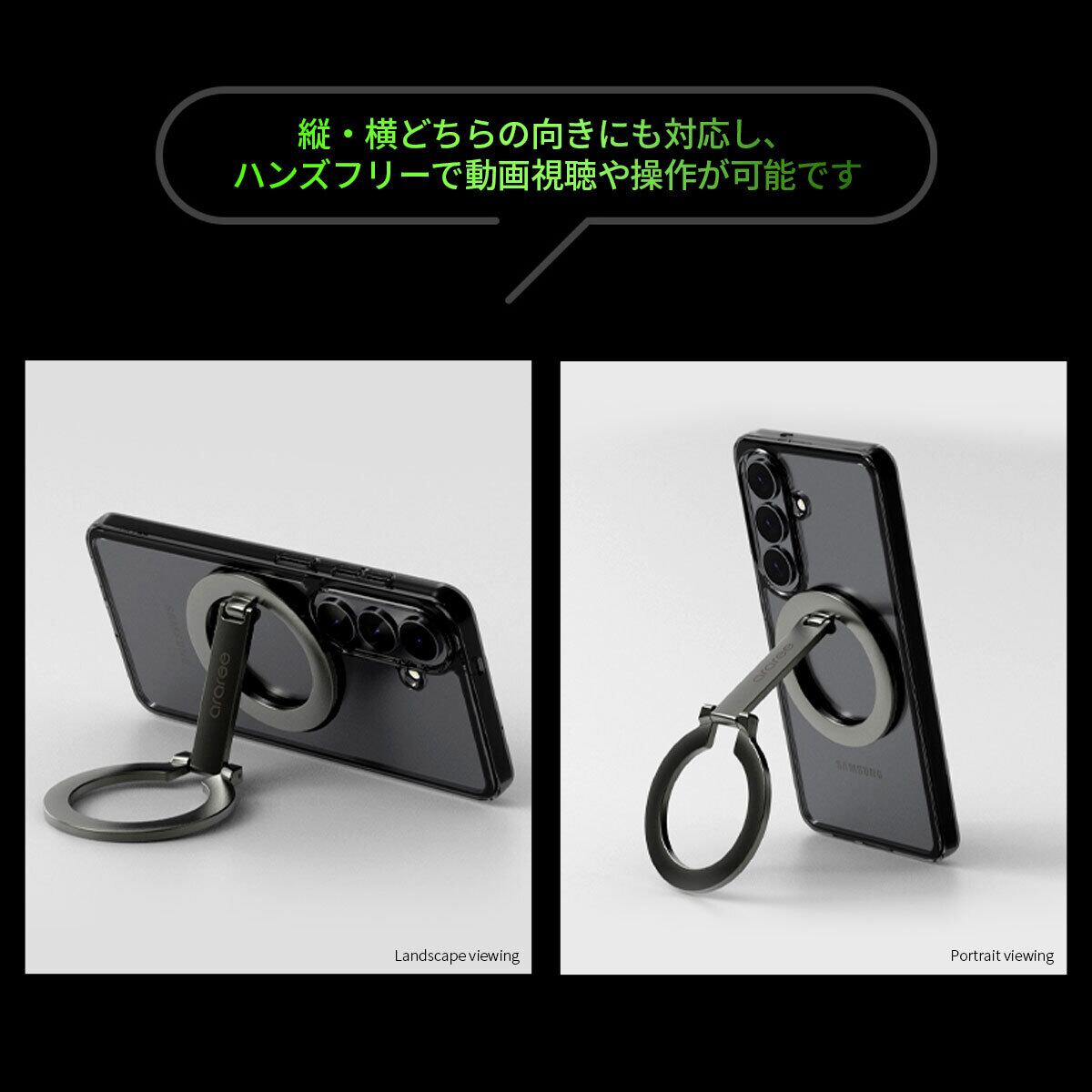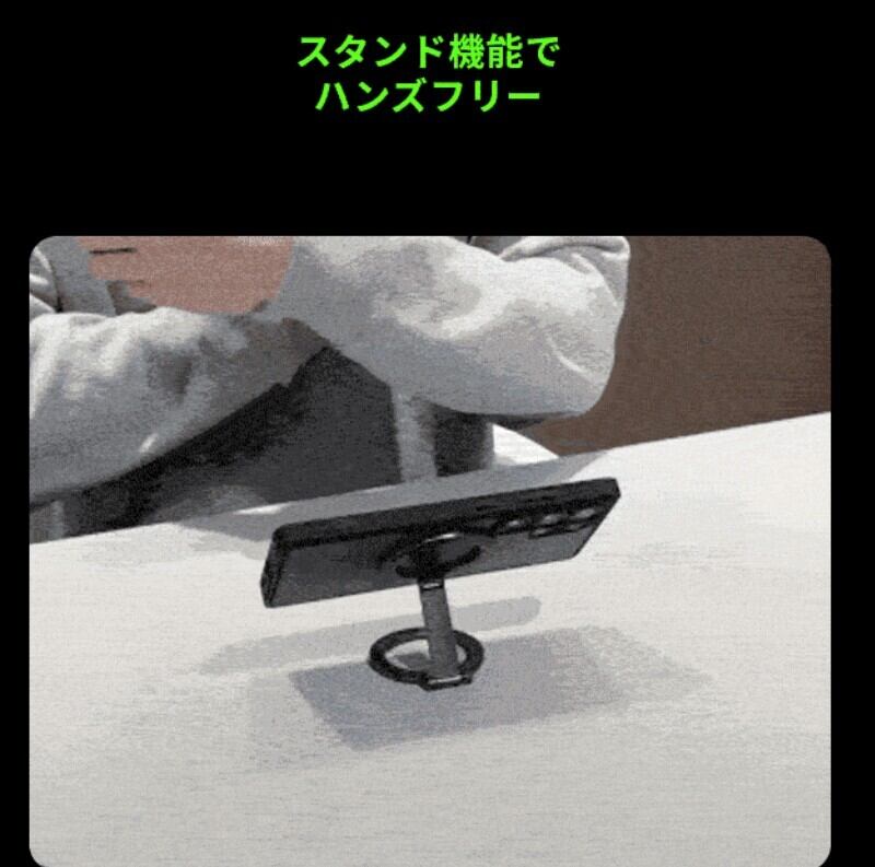 リングを立てるだけで安定したスタンドに。縦・横どちらの向きにも対応し、ハンズフリーで動画視聴や操作が可能です。