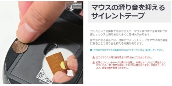 音が気になる場合には、付属のサイレントテープをマウス側の裏面に貼ることで滑り音を抑える効果があります。