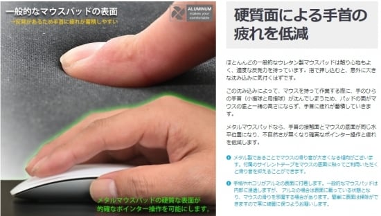 メタルマウスパッドなら、手首の接触面とマウスの底面が同じ水平位置になり、不自然さが無くなり確実なポインター操作と疲れを低減します。