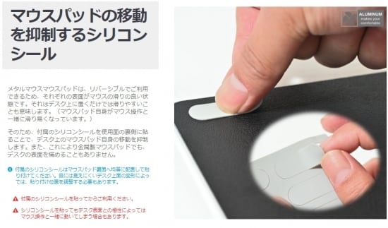 そのため、付属のシリコンシールを使用面の裏側に貼ることで、デスク上のマウスパッド自身の移動を抑制します。また、これにより金属製マウスパッドでも、デスクの表面を痛めることもありません。