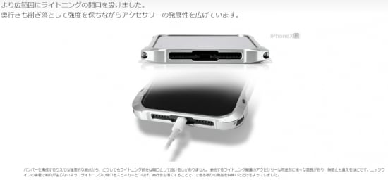 バンパーを構成するうえでは強度的な観点から、どうしてもライトニング部分は開口として設けるしかありません。接続するライトニング関連のアクセサリーは用途別に様々な商品があり、無限とも言えるほどです。エッジラインの装着で制約が生じないよう、ライトニングの開口をスピーカーとつなげ、奥行きも薄くすることで、できる限りの商品を併用いただけるようにしました。