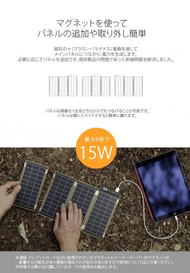 パネルは本体を含め最大6枚(2.5W×6枚=15W)まで可能です。