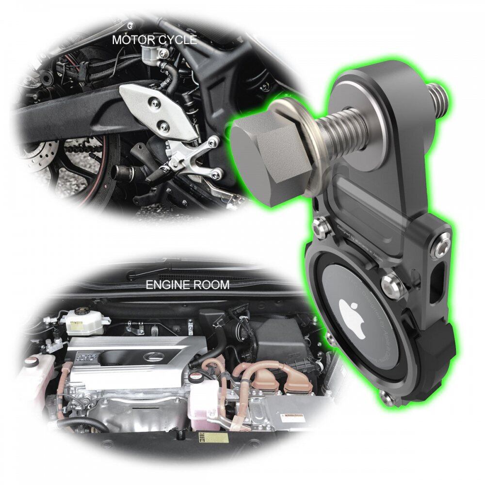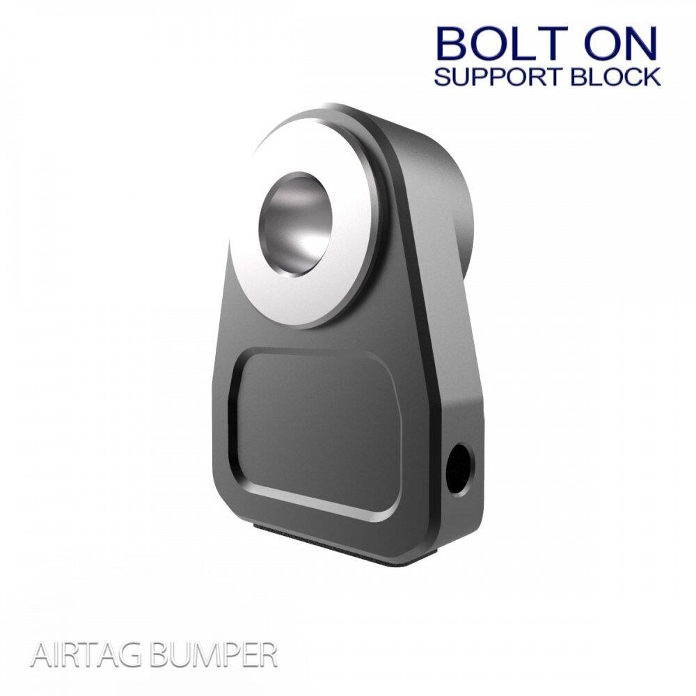 エアタグバンパーのオプション品「ボルトオン・サポートブロック」を利用すれば、自動車のエンジンルームやバイクのフレームなどに固定(ネジ止め)できるようになり、エアタグを盗難防止・追跡装置の一つとして忍ばせておくことが可能になります。