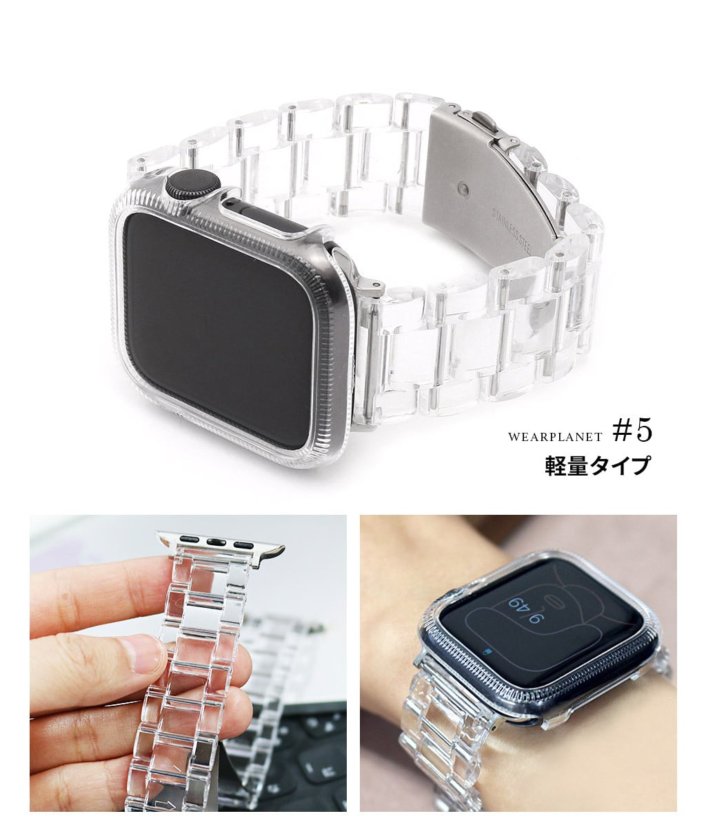 WEARPLANET(ウェアプラネット)の「保護ケース付きクリアチェーンバンド」は、透明度の高い素材を使用したクリアカラーが爽やかなApple Watchバンドです。