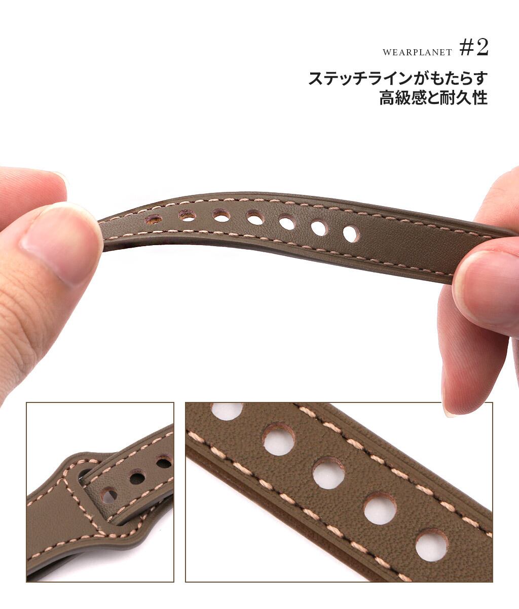 バンドの両端に施されるステッチが、高級感と耐久性を同時にもたらします。ステッチの糸は、革に合わせた最適なカラーが選ばれています。