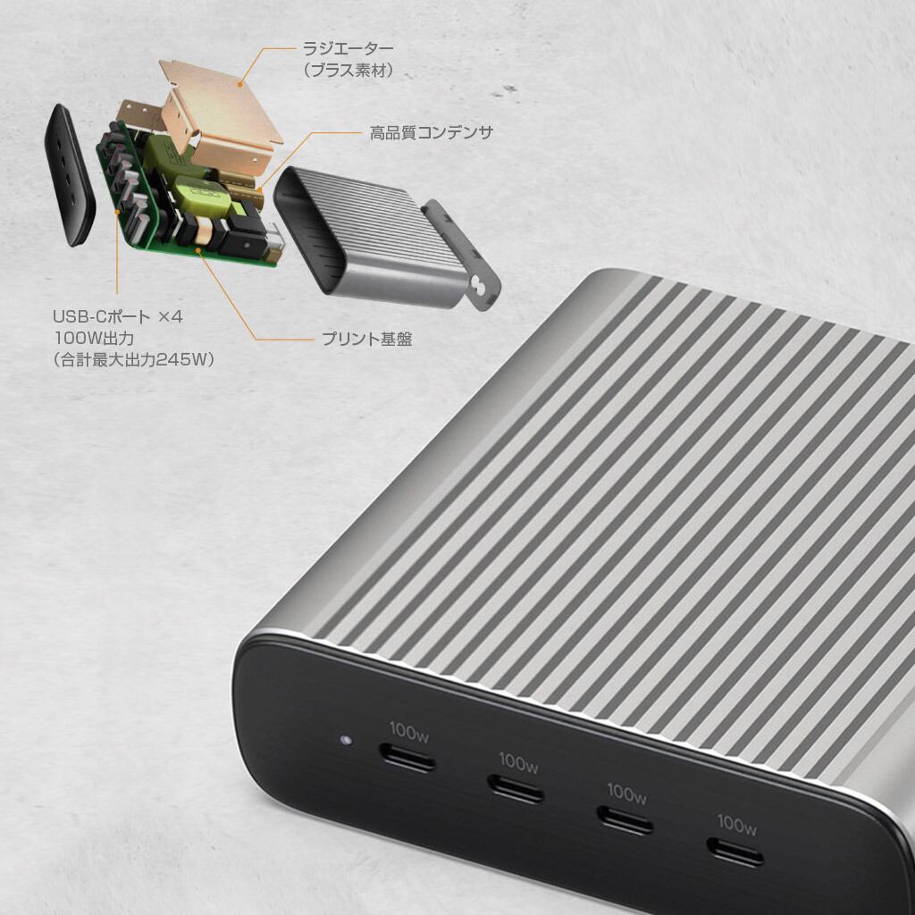 PowerDelivery対応のUSB-Cポートを4つ搭載。すべてのポートで100W出力が可能です。これら4つのポートを十分に活用できる、合計245Wの高出力仕様です。