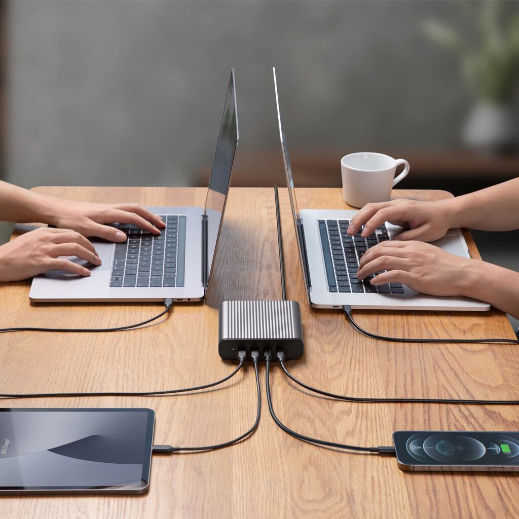 コンパクトな充電器で、13インチMacBook Pro/Airなどの中型ノートPCを4台同時に電源供給できます。16インチMacBook Proなどの大型ノートパソコン2台を急速充電しながら、タブレットとスマートフォンも同時に充電することも可能です。