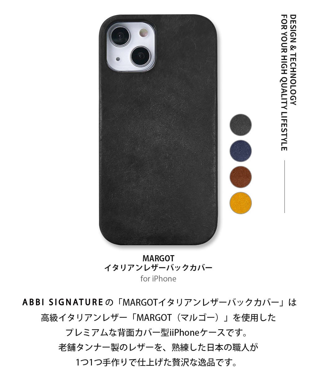 ABBI SIGNATUREの「MARGOTイタリアンレザーバックカバー」は高級イタリアンレザー「MARGOT(マルゴー)」を使用したプレミアムな背面カバー型iiPhoneケースです。老舗タンナー製のレザーを、熟練した日本の職人が1つ1つ手作りで仕上げた贅沢な逸品です。