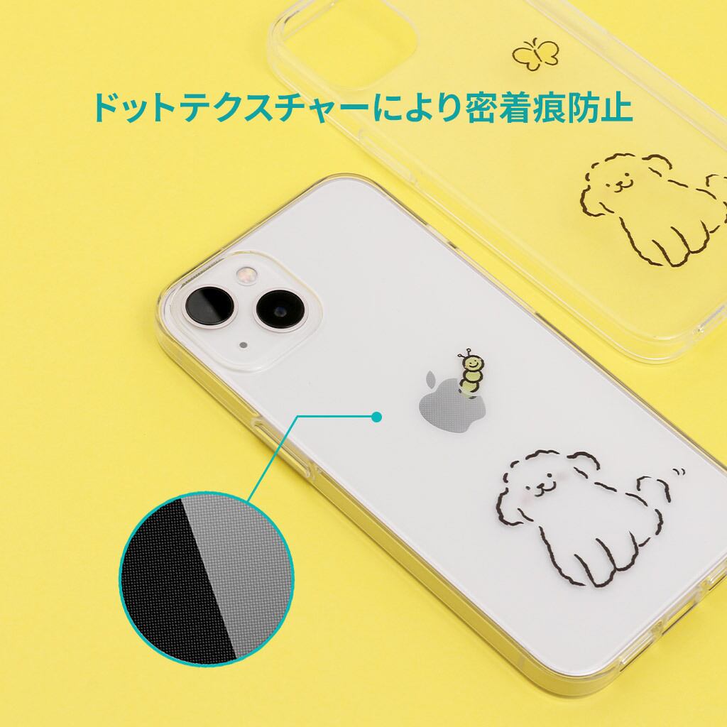 iPhoneに直接触れる内側にはドットテキスチャーが施され、密着痕を防ぎます。