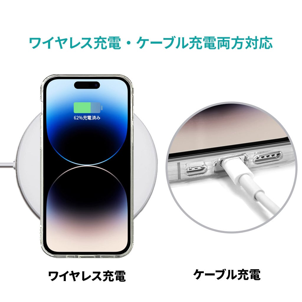 ケースをつけたままQi(チー)対応ワイヤレス充電とケーブル充電が可能です。
