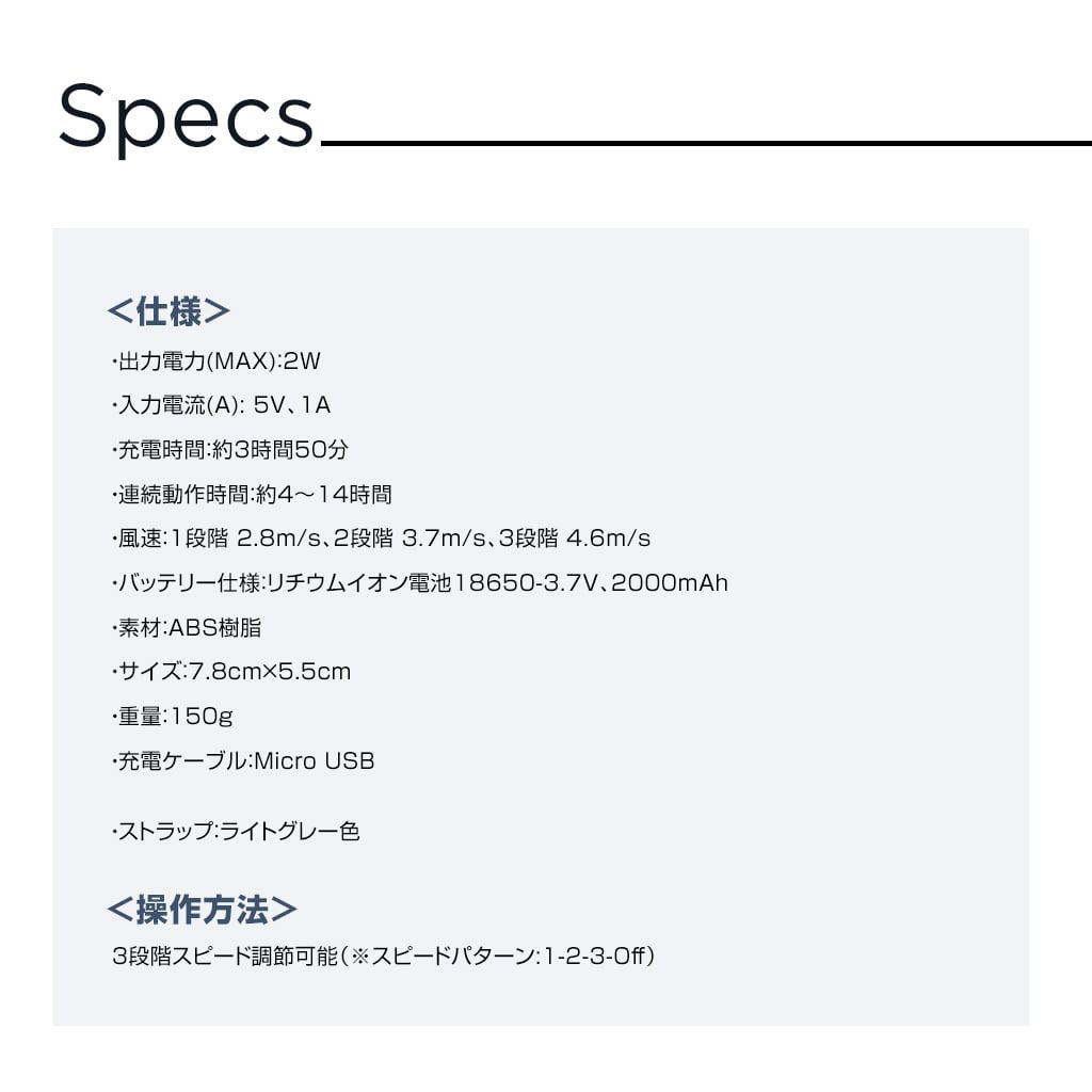 扇風機本体、充電用Micro USBケーブル、ストラップ、取扱説明書