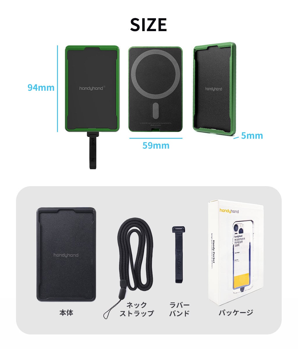「Handy Pocket MagSafe対応アルミカードケース」は洗練されたミニマルデザインで、機能性を追求したカードケースです。2枚のカードがジャストフィットに収納でき、MagSafe機能でしっかり固定。また、付属のラバーバンドやネックストラップも使って、さらなる利便性をお楽しみいただけます。