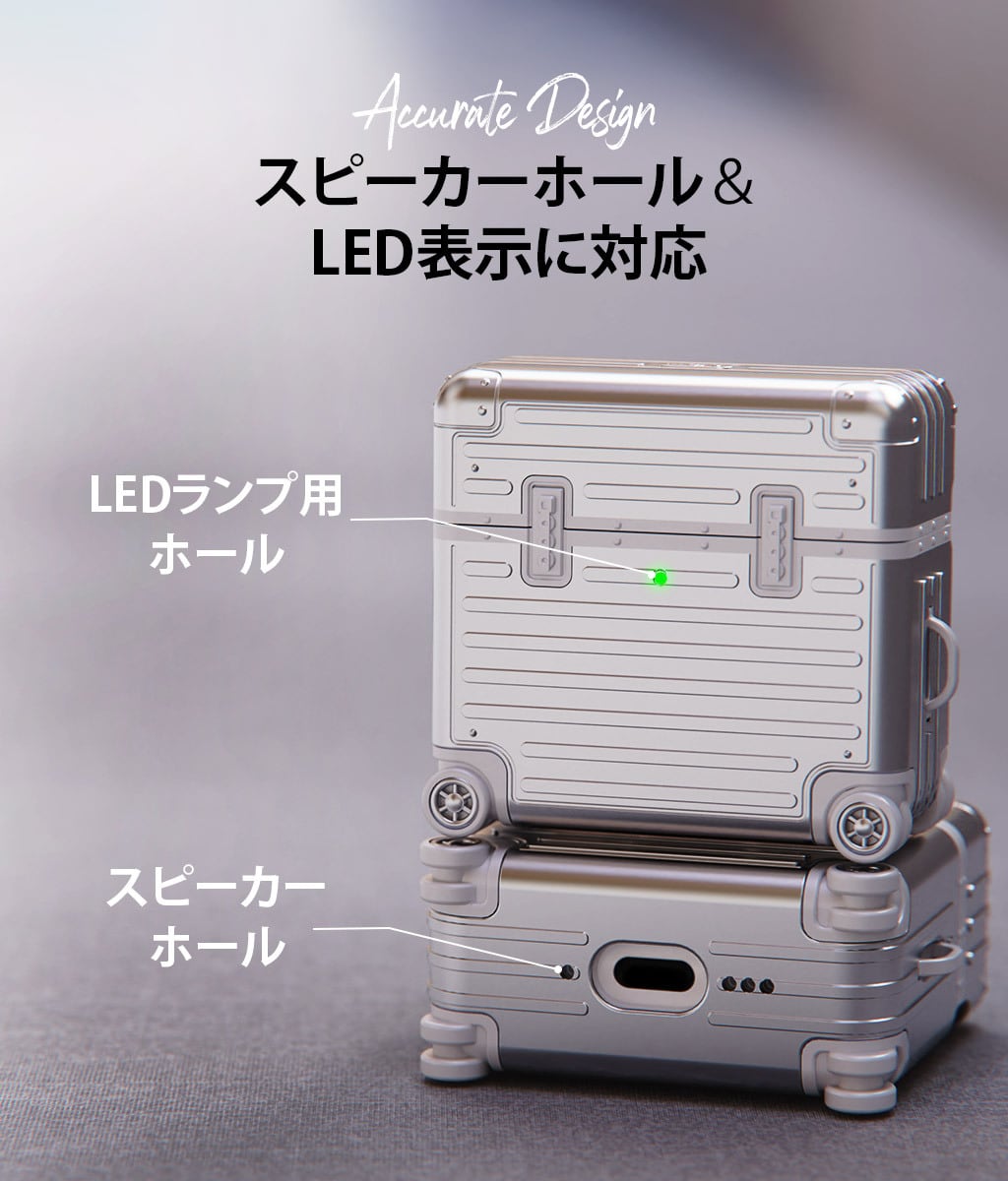 miak 「キャリーケース」は細部にまでこだわったスーツケースデザインがユニークなAirPods 4専用ケースです。軟質のTPUと硬質なポリカーボネートの二重構造でしっかり保護、持ち運びに便利なカラビナも付属します。